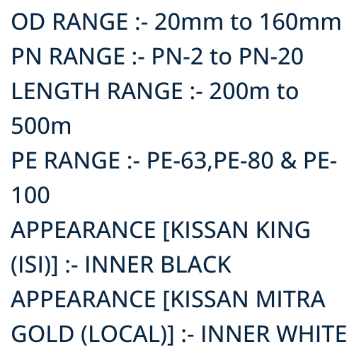 • PE RANGE :- PE-63, PE-80, PE-100